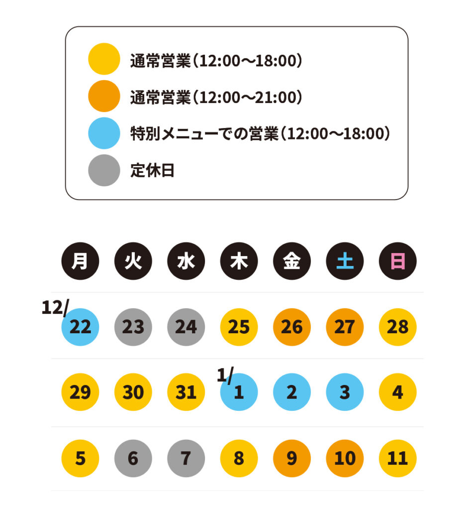 • 12/30(月)・12/31(火)・1/1(水)・1/2(木)・1/3(金)も営業