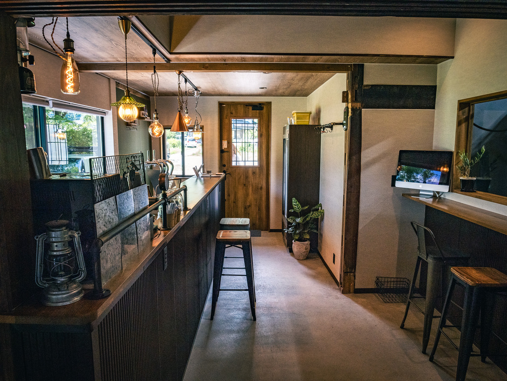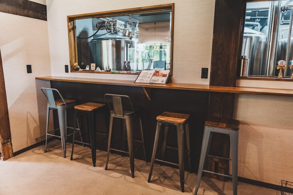 タップルーム&カフェは、古民家の温かみある梁と柱が残る空間。入口を抜けると、醸造タンクを望む大きな窓と、立ち飲みカウンター・窓側席が穏やかな時間を演出します。